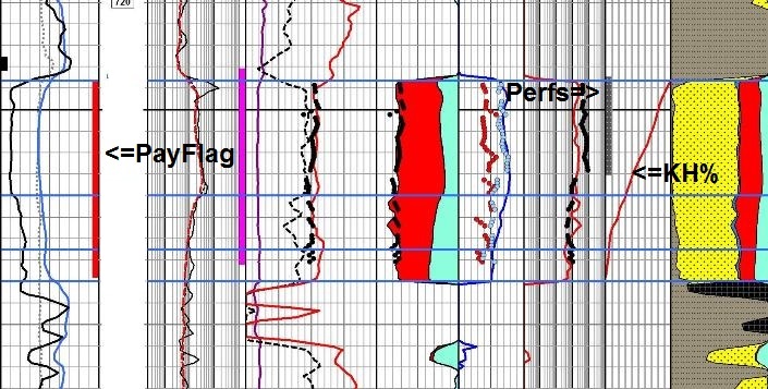 Intervals with the steepest slope on the KH% curve are the most productive and should be perforated if not too close to water or gas. Where the KH% curve is near vertical, no perfs are required.