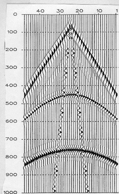 Seismic ray paths, as shown below, are rarely straight lines, but rather follow the laws of refraction, resulting in curved ray paths. The exact shape of the path is determined by the rock velocity distribution versus depth and the spread geometry. In the seismic record shown below, the apparent curvature of the seismic reflections is caused by these factors.