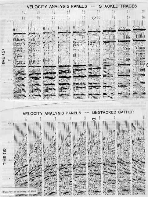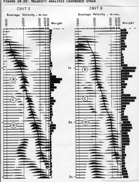 A large number of semi-automatic techniques have been developed to derive seismic velocity from seismic data independently of well log data, The illustration below show two types of velocity analysis display. Many others have been developed over the years. The principle of such techniques is based on computerized approximations to normal moveout analysis which used to be done by hand calculation. The normal moveout is often called delta-T, just as the sonic log interval transit time is called delta-T by log analysts (abbreviated DTC in this Handbook), so we will always use the term normal moveout (abbreviated NMO) to avoid confusion. My first job as a geophysical engineer in 1967 was to plot NMO versus depth, pick the slopes of the graph and enter the data into a TIAC computer to calculate velocity.