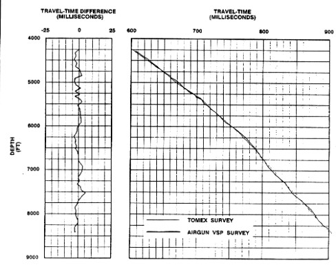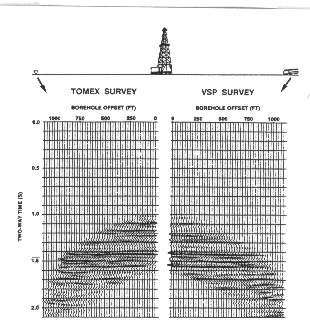 De-convolution of the recorded geophone traces with this signature produces the seismic traces. Traces are stacked continuously as drilling proceeds and an output trace is generated every 10 feet of drilled depth. By taking into account the geometry of the drill bit and geophone locations, the VSP section can be displayed. Data quality is comparable to conventional VSP data, as shown in the comparative example below. Rig noise can sometimes be a problem, but it can usually be cured.
