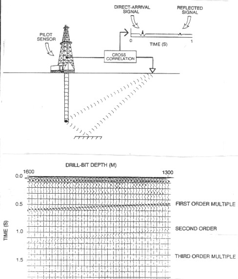The continuous signals from the drill bit are transformed into VSP displays using cross correlation and de-convolution. The energy source signature is obtained by continuously recording the vibrations on the drill pipe. The time lag for the reference signal to travel up the pipe is calculated from the length of the pipe and the velocity of sound in steel. Cross correlation is used to define the signature in the same way as for Vibroseis sources.