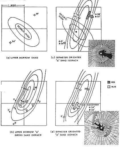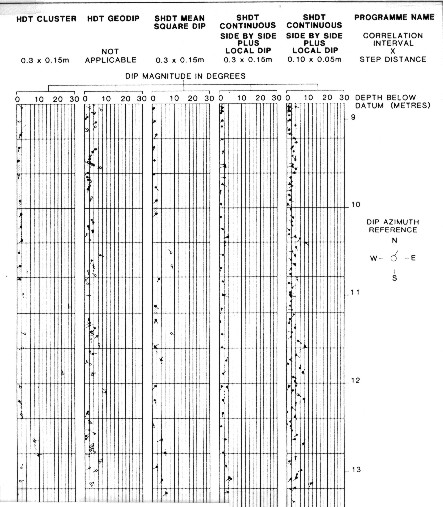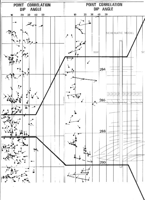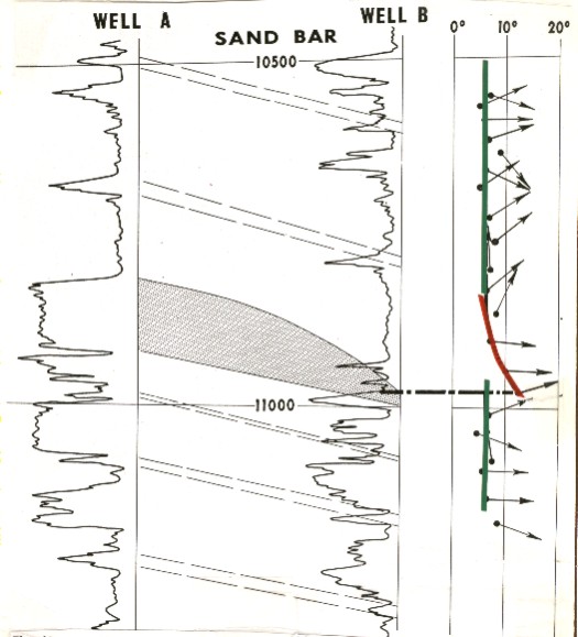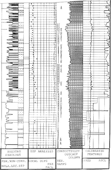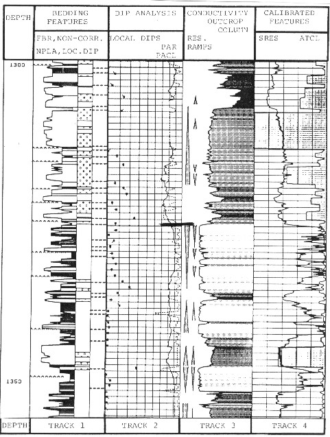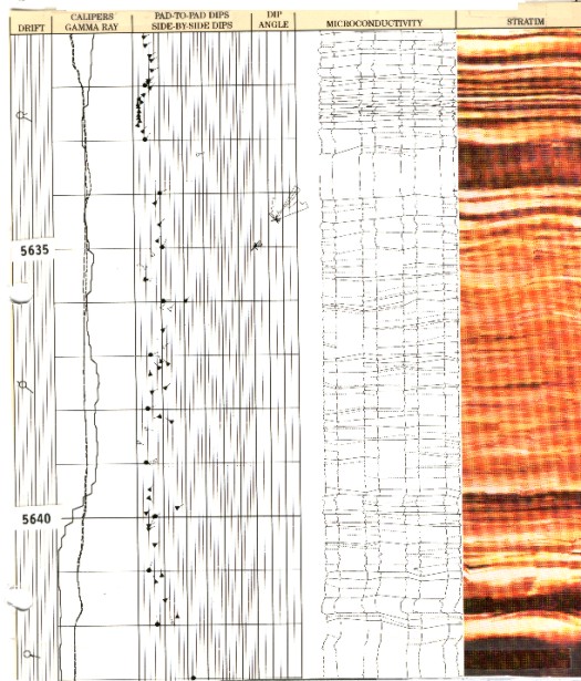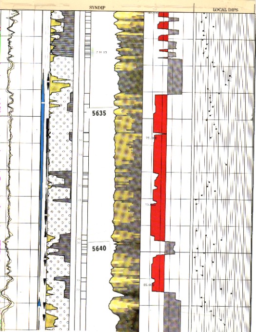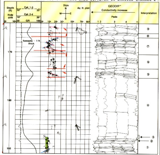 by the high resistivity kicks in each sand. Dipmeter patterns